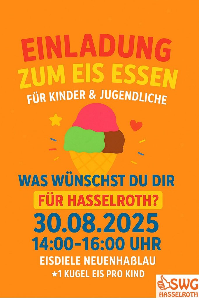 Passend zu dem herrlichen Sommerwetter laden wir gerne Euch, liebe Hasselrother Kids & Jugendliche, auf eine Kugel Eis in die Eisdiele nach Neuenhasslau ein !