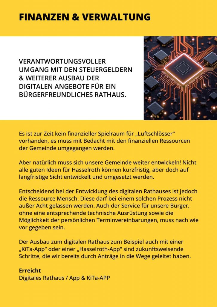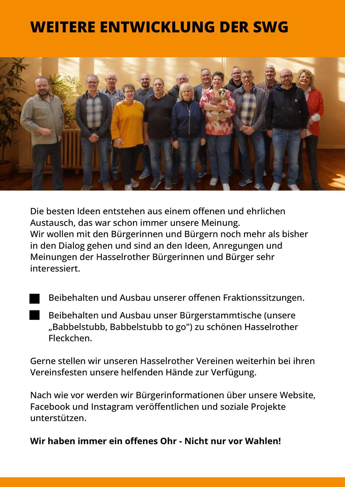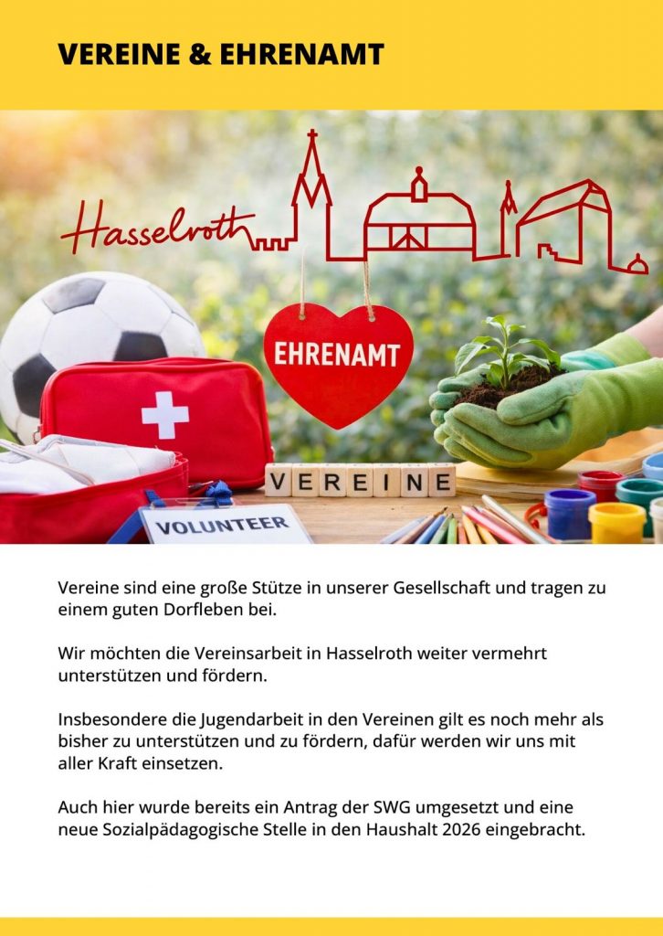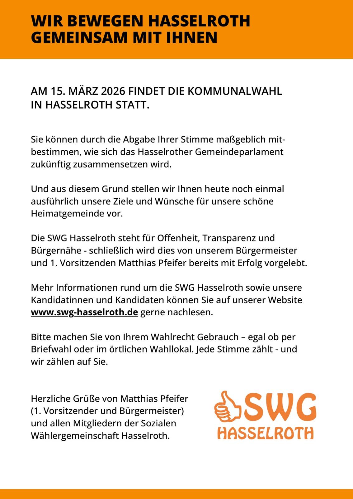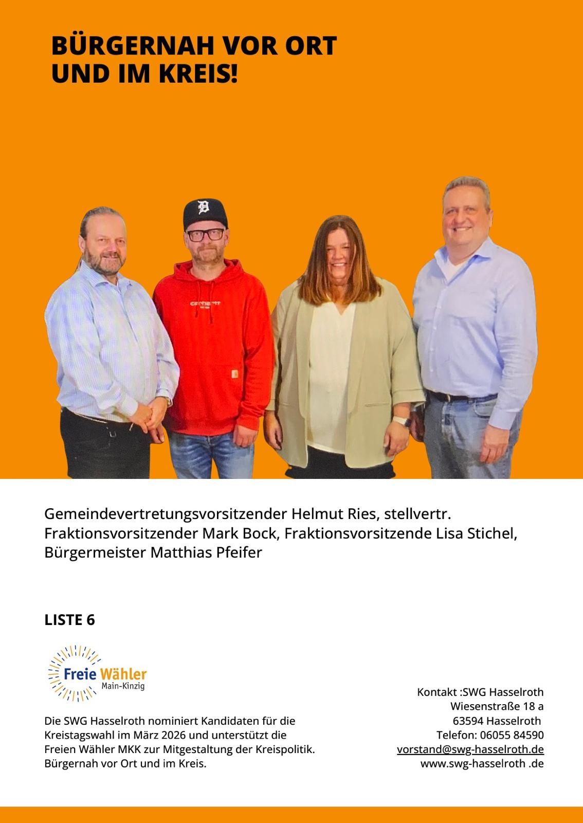 Da ist er – unser finaler Flyer zur Kommunalwahl am 15.03.2026 5. Februar 2026 SWG Hasselroth Aktuelles Quasi druckfrisch verteilt vor wenigen Tagen an alle Hasselrother Haushalte : Teilen Sie dies Twitter Facebook LinkedIn E-Mail Frühere Beiträge Jubiläumsfest zum 30-jährigen Bestehen der SWG Hasselroth – Programm für Samstag, 07.03.2026 Seien Sie dabei und feiern Sie mit uns ! Wir freuen uns auf Sie !… Herzliche Einladung zu unserem nächsten Bürger-Stammtisch am 03.03.2026 Es geht weiter mit der beliebten „Babbelstubb“ – den Bürger-Stammtischen der SWG Hasselroth. Nachdem seit… Einen guten Informationsaustausch… ...hatten wir heute bei unserem Infostand an der Postfiliale in Neuenhasslau. Wir kamen auch heute…