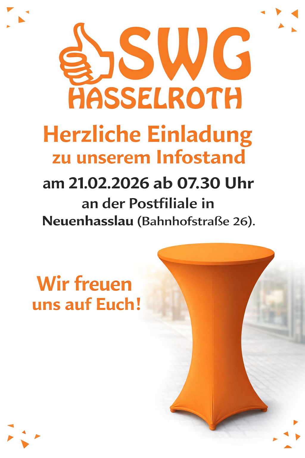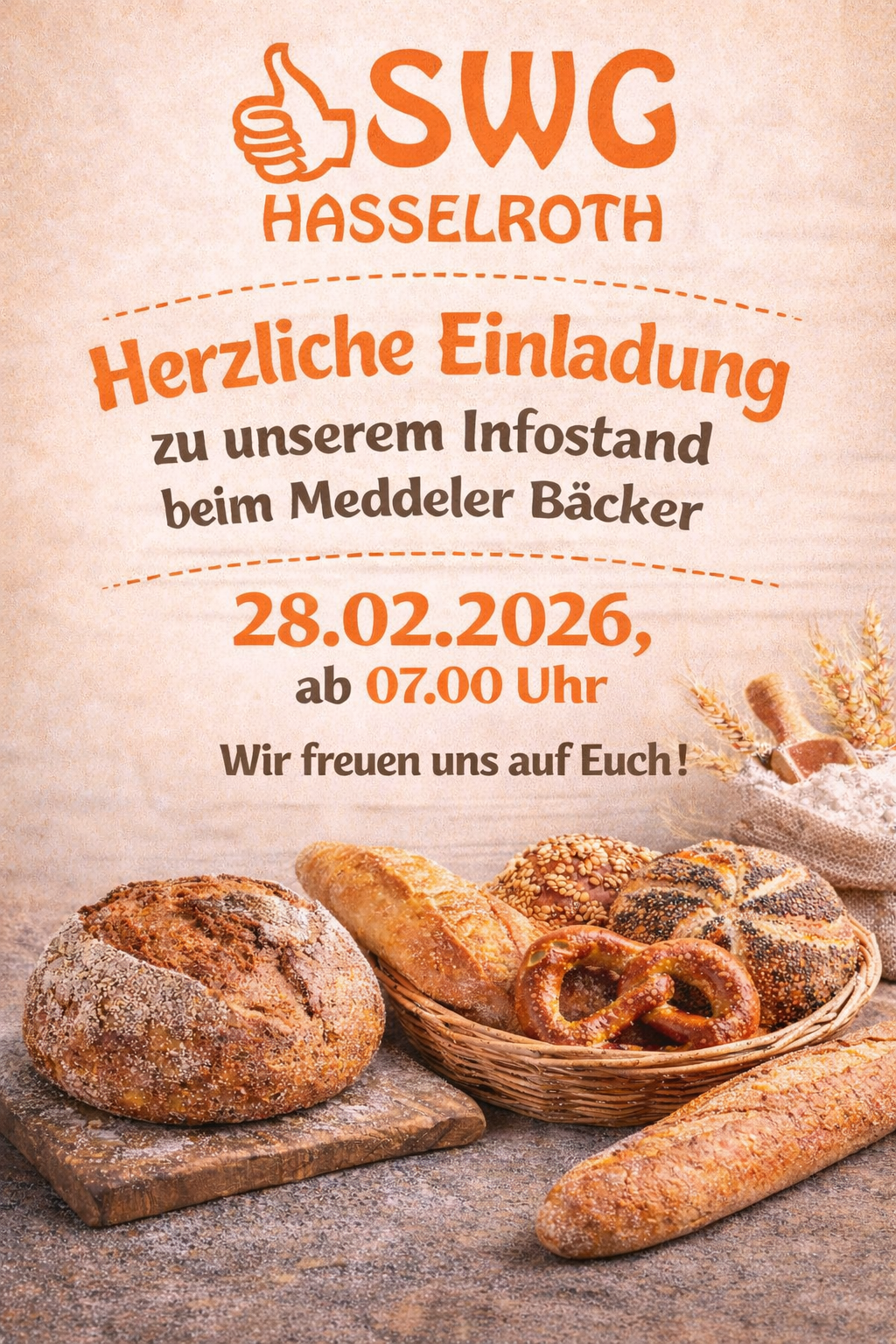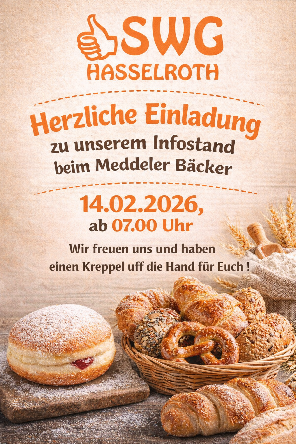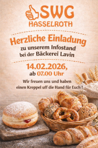 …und zwar am 14.02.2026 ab 07.00 Uhr bei unseren Infoständen beim Meddeler Bäcker (Alte Dorfstrasse 68) und bei der Bäckerei Lavin (Alte Dorfstrasse 83), am 21.02.2026 ab 07.30 Uhr an der Postfiliale in Neuenhasslau (Bahnhofstraße 16) sowie am 28.02.2026 nochmal ab 07.00 Uhr beim Meddeler Bäcker in Niedermittlau.