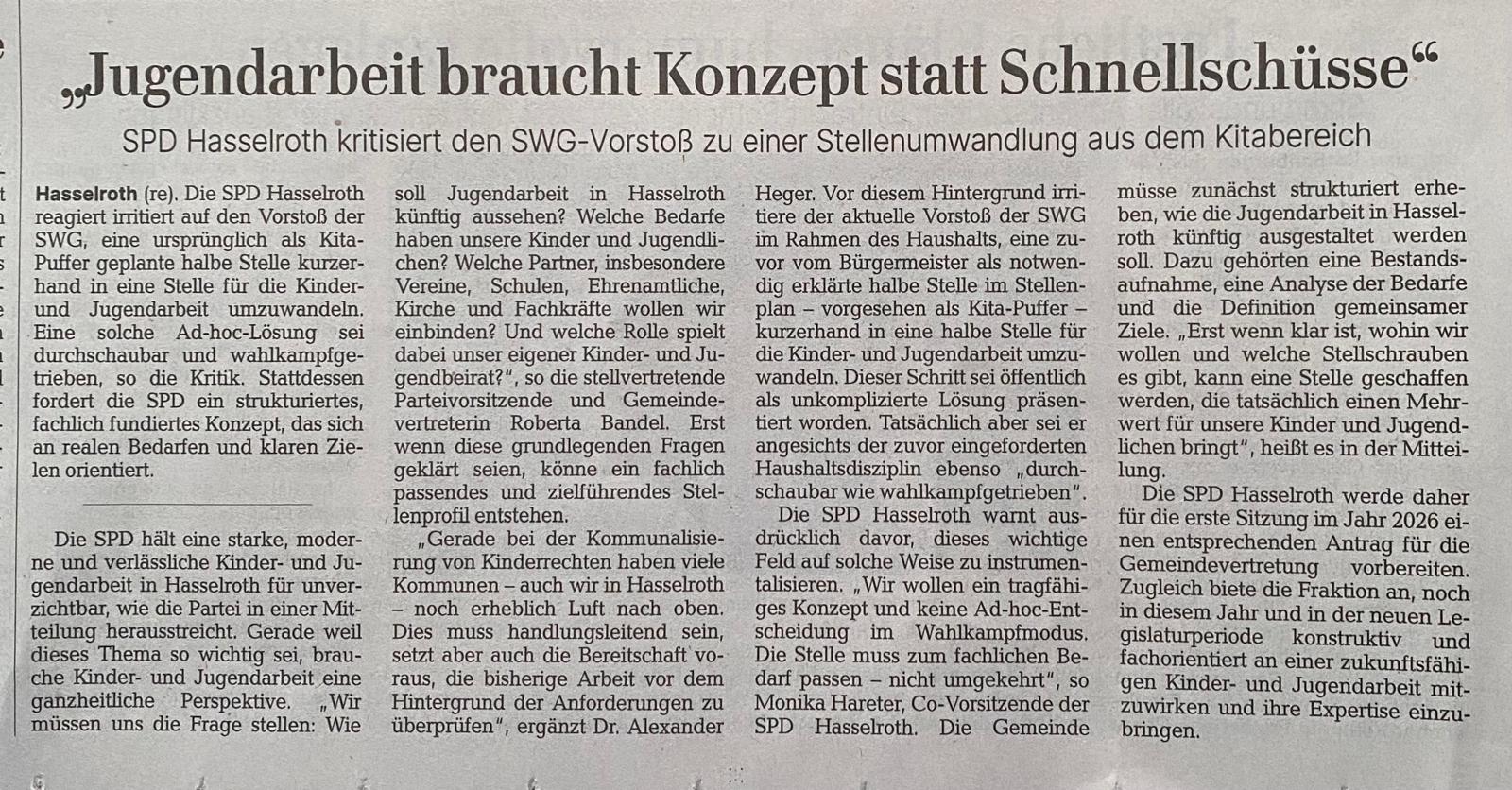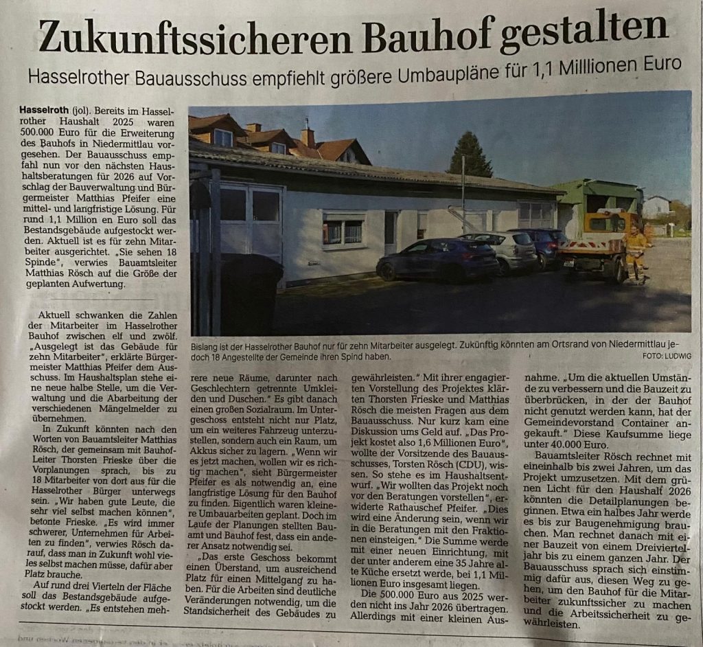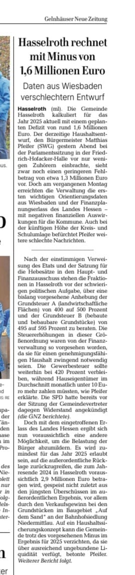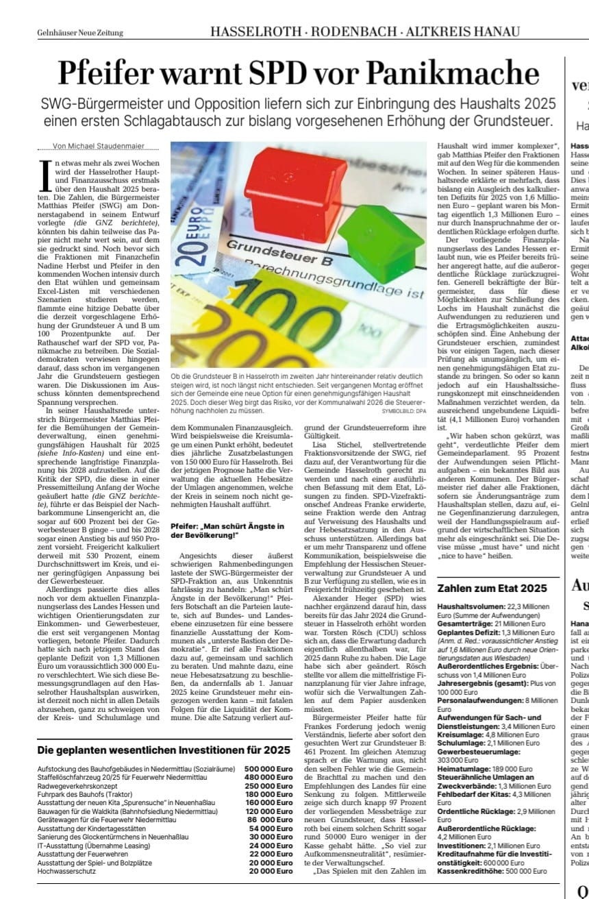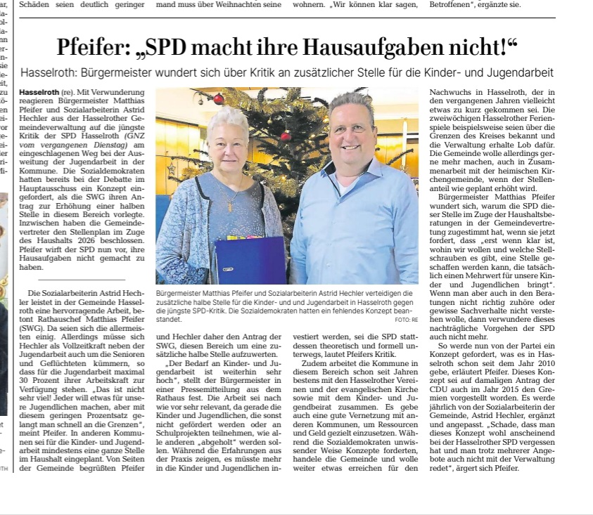 Artikel aus der GNZ vom 10.12.25 (Artikel SPD), 13.12.25 (Statement Rathaus) und 19.12.25 (Statement SWG Hasselroth) sowie der Presseartikel aus der GNZ über die besagte Gemeindevertretersitzung