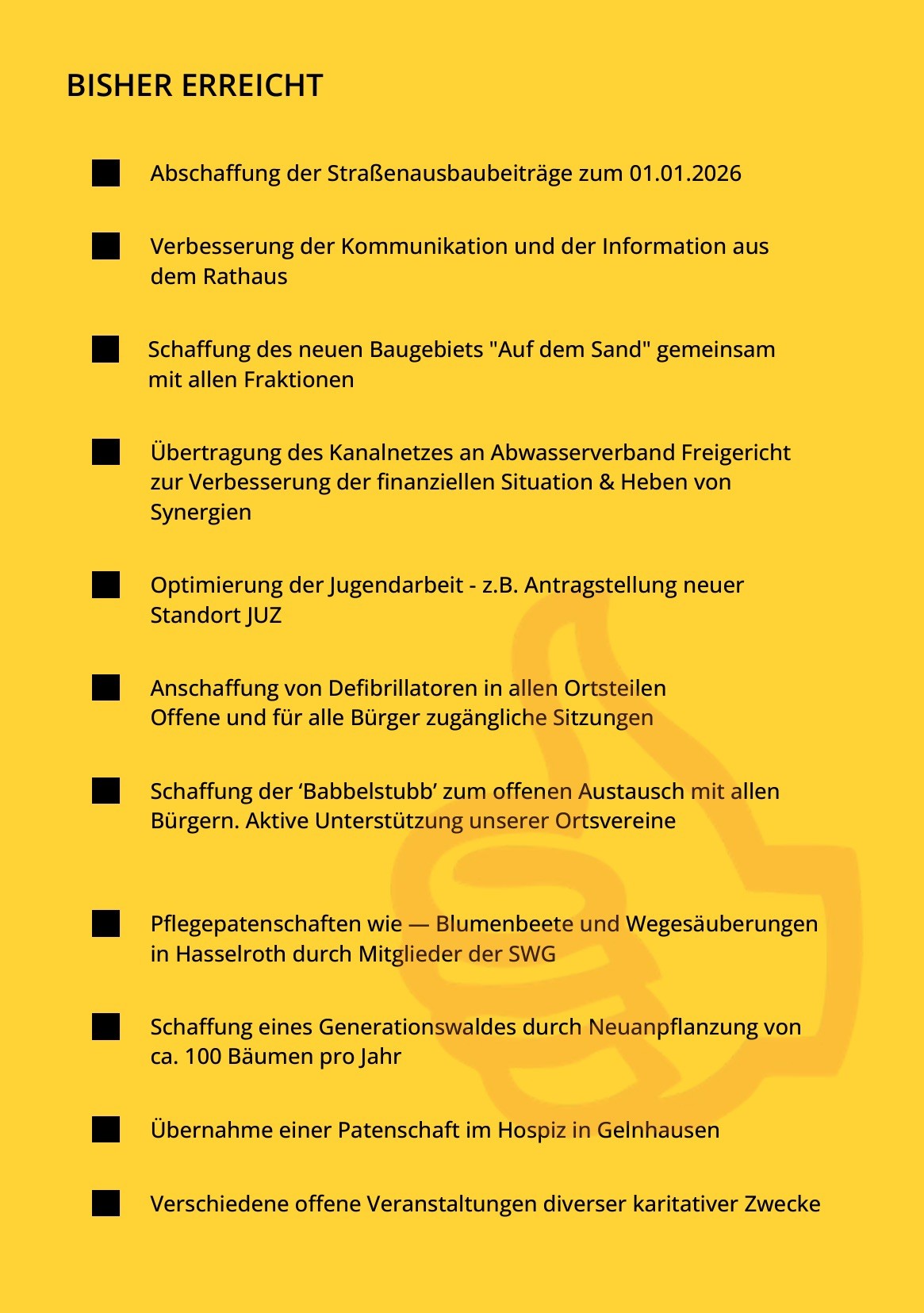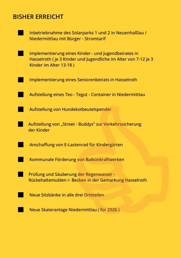 Wir wünschen uns zukünftig eine bessere Zusammenarbeit um unseren Ort voranzutreiben und auch weiterhin werden wir uns zum Wohle und im Interesse der Bürger handeln und nicht mit Parteiblindheit oder Eigeninteresse handeln. Das Wohle der Bürger steht für uns an erster Stelle.