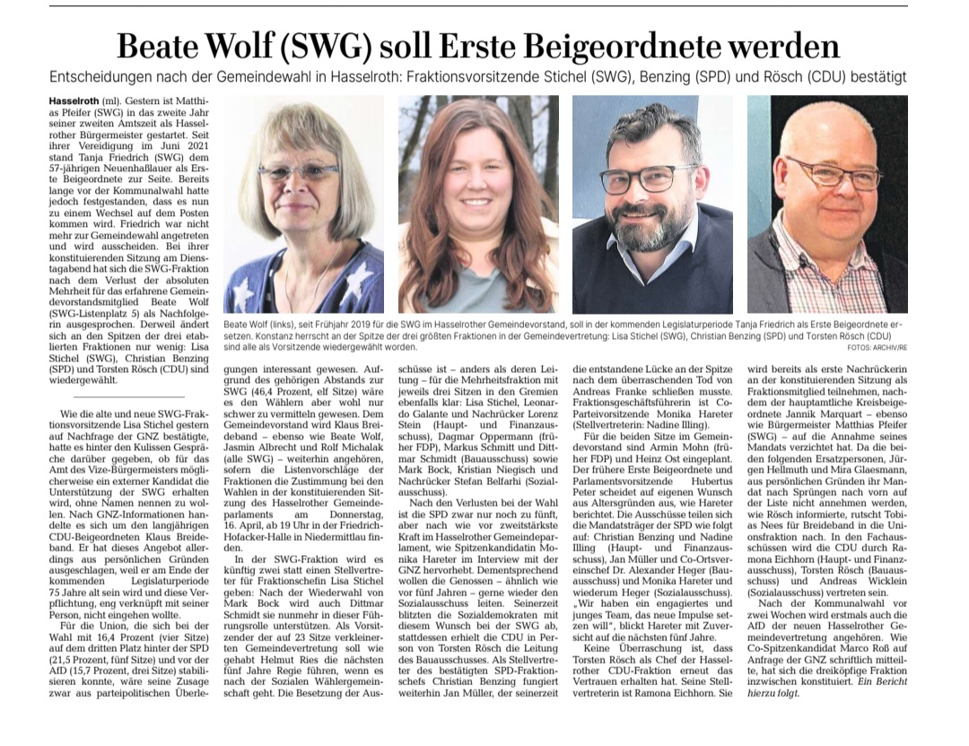 Für die Besetzung im Gemeindevorstand wurden einstimmig Beate Wolf (als zukünftige erste Beigeordnete), Jasmin Albrecht sowie Rolf Michalak vorgeschlagen.